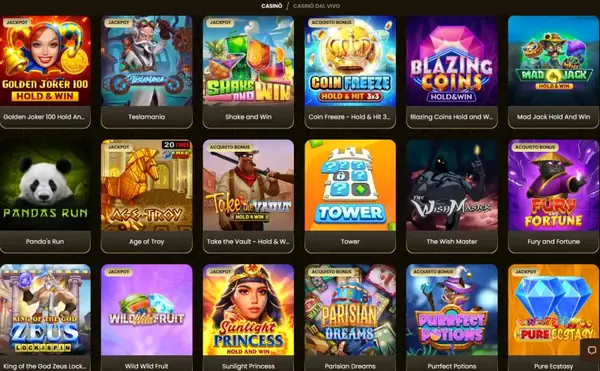 Ospitiamo 8.000 giochi e manteniamo le categorie facili da consultare, con filtri per volatilità , funzionalità e provider. La nostra libreria include titoli di Pragmatic Play, Play'n GO, Evolution Gaming, BGaming, Relax Gaming, Spinomenal, NetEnt, Novomatic, Big Time Gaming e Belatra. Se sei qui soprattutto per le slot Goldspin, puoi cercare Megaways, bonus buy e opzioni ad alta volatilità , oltre a nomi popolari come Book of Ra e Starburst. Offriamo anche giochi da tavolo classici come Blackjack, Roulette e Baccarat, insieme a una sezione completa con dealer dal vivo.