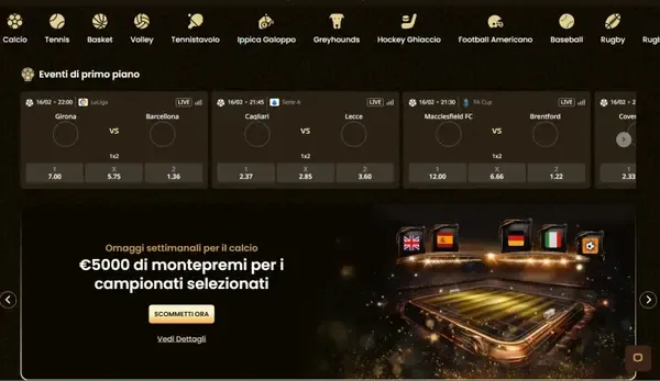 La nostra sportsbook è pensata per i giocatori che vogliono un unico account per il gioco al casinò e le scommesse sportive. Puoi scommettere sugli sport più seguiti in Italia, inclusi calcio, tennis, basket e motorsport, con mercati che coprono sia le competizioni maggiori sia gli eventi quotidiani. Il live betting è disponibile, così puoi seguire un evento in tempo reale e piazzare scommesse mentre le quote cambiano durante la partita. Goldspin mira a mantenere quote competitive e puoi passare dallo sport ai giochi da casinò senza spostare fondi tra wallet separati.