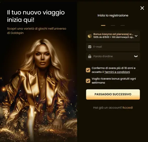 Apri la homepage di Goldspin Casino e seleziona Registrati.