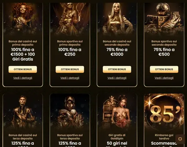 Il pacchetto di benvenuto Goldspin è una serie su tre depositi pensata per i giocatori in Italia che usano EUR. Il primo step include un bonus di abbinamento più giri gratis, mentre il secondo e il terzo step puntano su percentuali di match più alte sui depositi successivi. Ogni step richiede un deposito minimo di €10 e si applicano requisiti di puntata prima di poter prelevare le vincite legate al bonus.