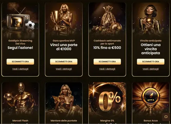 Le promo di Goldspin Sports sono pensate per aggiungere valore extra alle scommesse che ti piace giĂ piazzare, con benefici chiari mostrati su ogni riquadro promo e regolamento completo.
