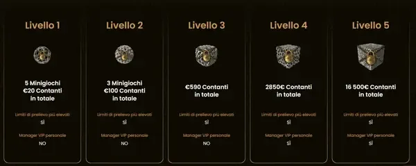 I livelli VIP Goldspin sono dove la fedeltà si trasforma in upgrade reali e visibili: guadagni punti VIP giocando con denaro reale e, man mano che sali di livello, sblocchi premi fedeltà e limiti di prelievo più alti mostrati direttamente nella schermata VIP. Quando si sblocca un premio fedeltà , la schermata indica che riceverai un’email che ti inviterà a riscattarlo.